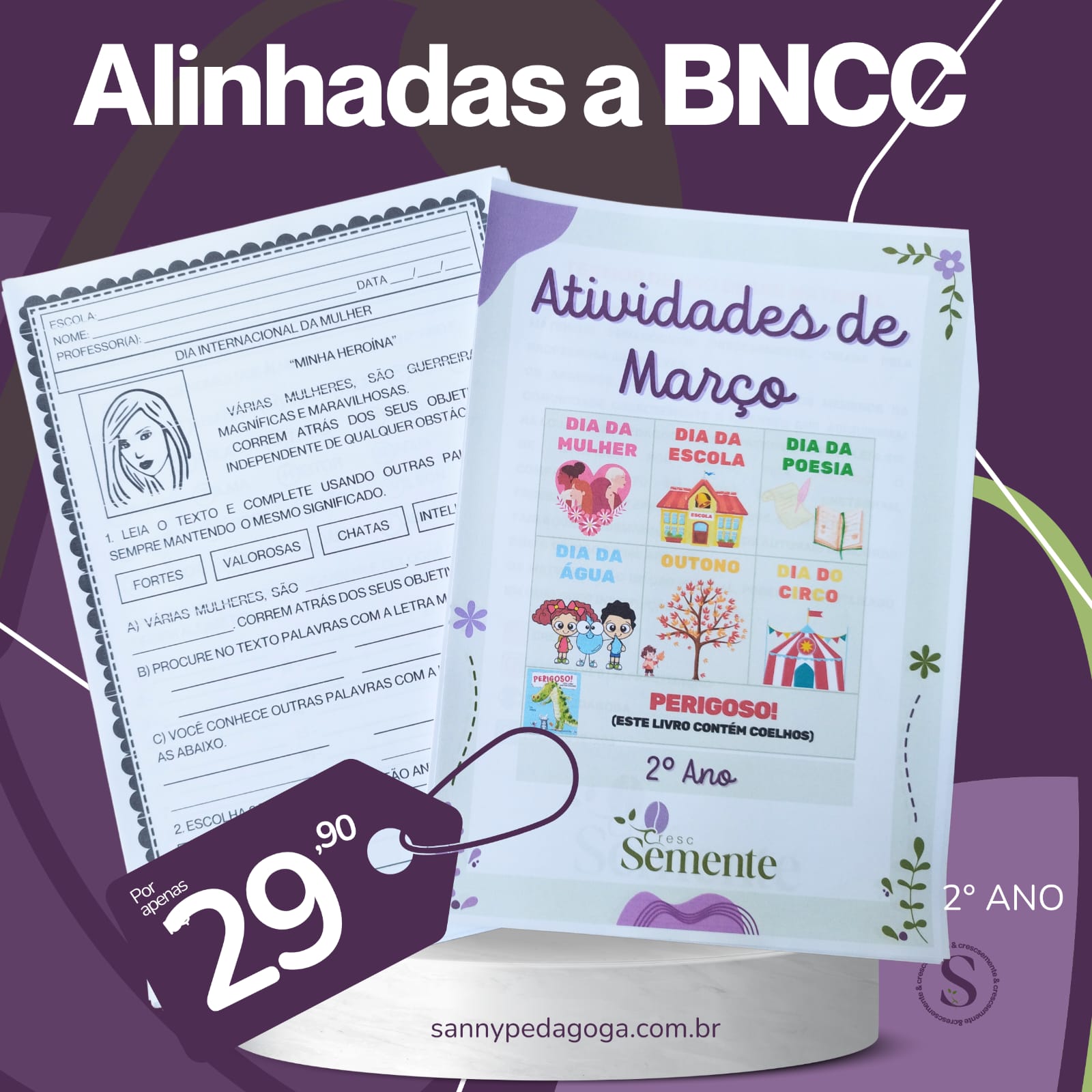 Esse material é formado por um PDF com atividades para turmas de 2º ANO contendo 38 páginas destinadas ao mês de março, todas alinhadas a BNCC e acompanhando os códigos (habilidades) contemplando todas as disciplinas e com algumas temáticas de datas comemorativas referentes ao mês de março.