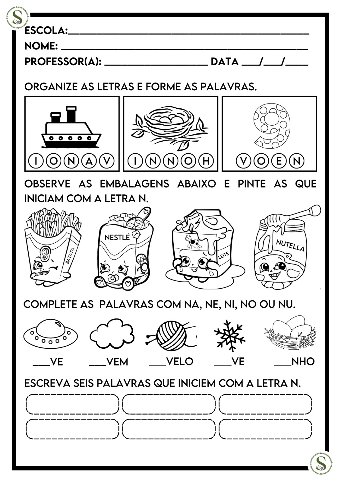 Esse material é um pdf composto por 53 páginas, as atividades são para base do processo de alfabetização, apresentando uma sequência de nome próprio, vogais, encontros vocálicos e todas consoantes do alfabeto.