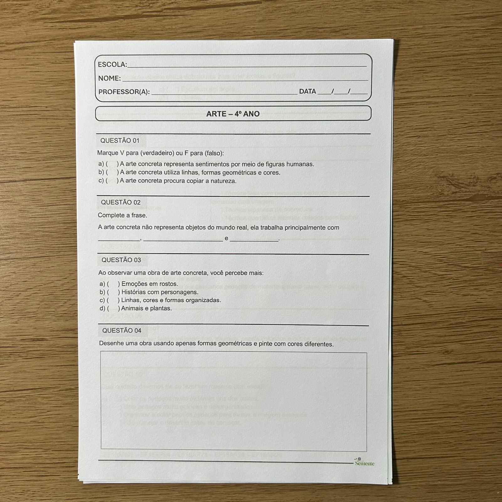 Possui Avaliações de: Língua Portuguesa,  Matemática, Ciências , História, Geografia, Ensino Religioso e Arte. (Arte e Ensino cada avaliação com 5 questões)