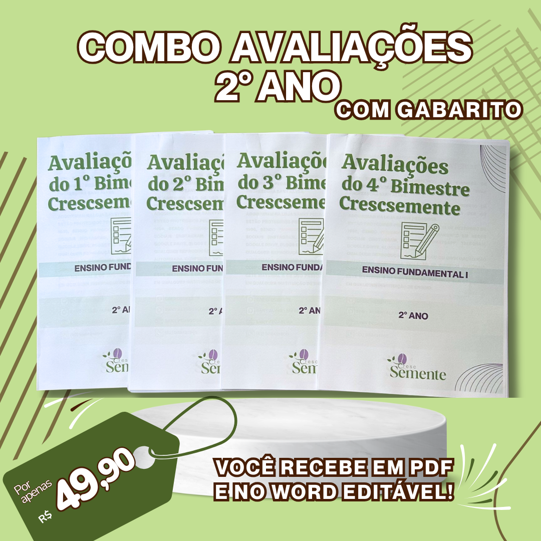 ESSE MATERIAL É COMPOSTO POR AVALIAÇÕES DOS 4 BIMESTRES DO ANO. AO ADQUIRIR VOCÊ RECEBE AS AVALIAÇÕES NO FORMATO WORD (EDITÁVEL) E PDF, ALÉM DE TAMBÉM ACESSAR O GABARITO DE TUDO!